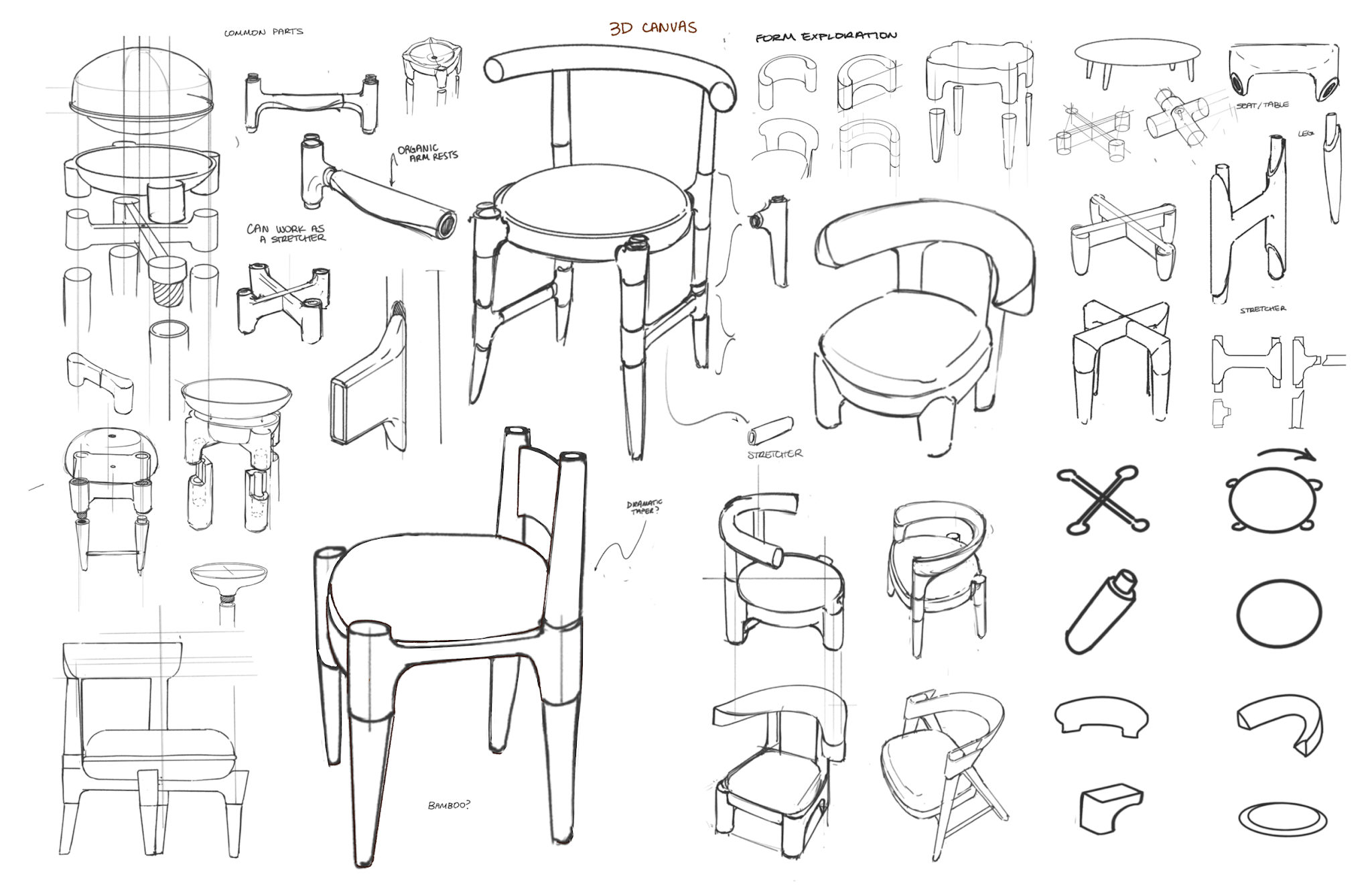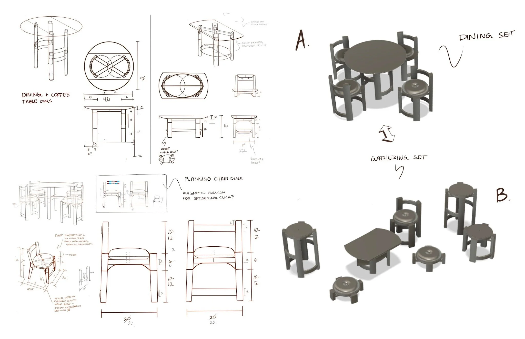 Exploring designs for young adults, I focused on creating a portable dining set that balances comfort, expression, and elegance. Upholstery and color add softness, while thoughtful details encourage semi-permanence. The circular form invites conversation and connection, making it ideal for college living—compact enough to move between spaces, yet designed to bring people together. The design language carries throughout the set, creating a cohesive, approachable collection.