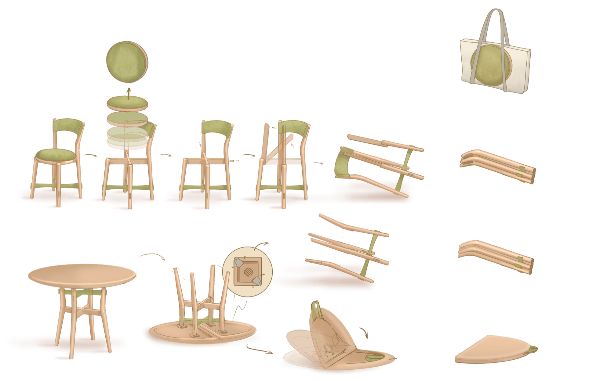 The Noma Dining Set explores furniture designed for people in transition, whether moving for college, internships, or new career opportunities. The collapsible set prioritizes movability, adapting to limited transport space and the frequent relocations that define young adult life.