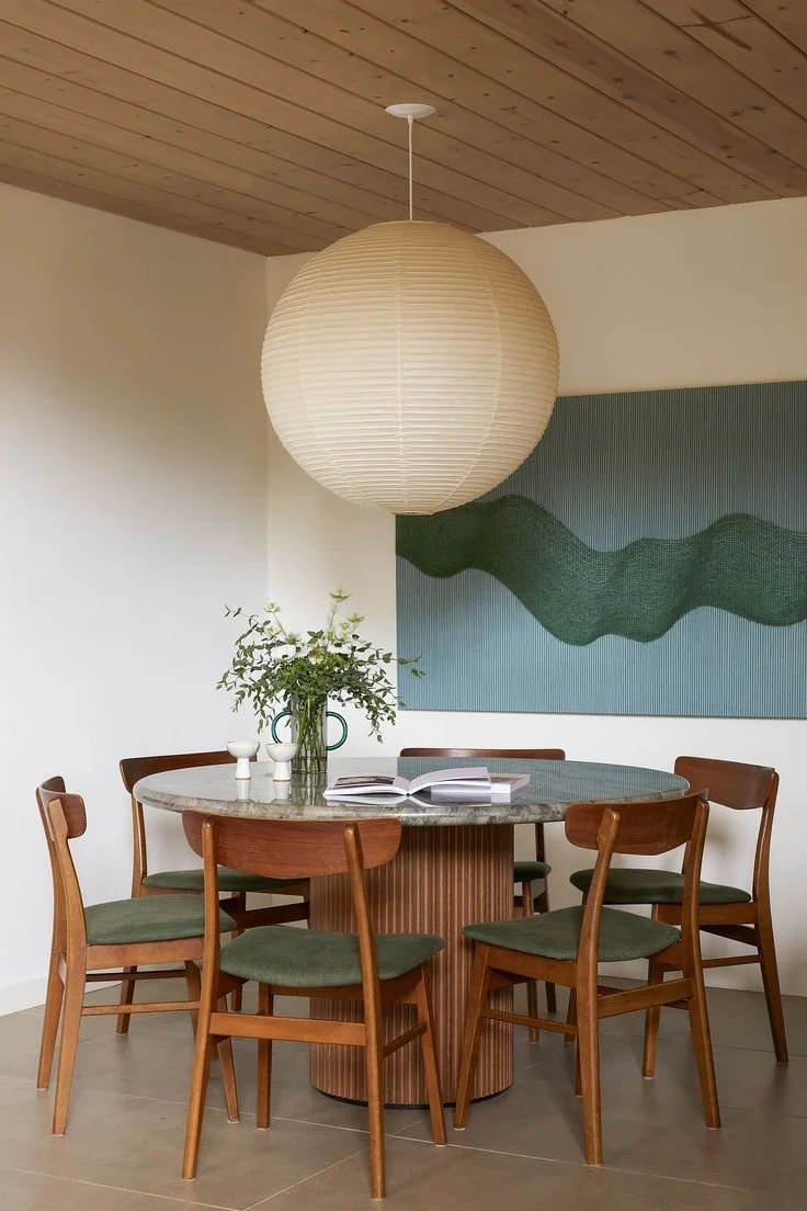 Final images of the completed build show the design realized as envisioned. A circular rug complements the table and overall color palette. The piece was featured in the 2025 DAAPworks capstone exhibition.